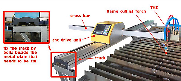 When you are going to use CM-P1530E to cutting the metal plate, follow these steps:a. Fix the track by bolts beside the metal plate that needs to be cut.b. Assemble the CNC drive unit on the track and then assemble the cross bar on the CNC drive unit. (Installation method can be seen in the video)c. Assemble the THC (torch height control). (Installation method can be seen in the video)d. Assemble the cutting torch (flame cutting torch or plasma cutting torch) on THC.