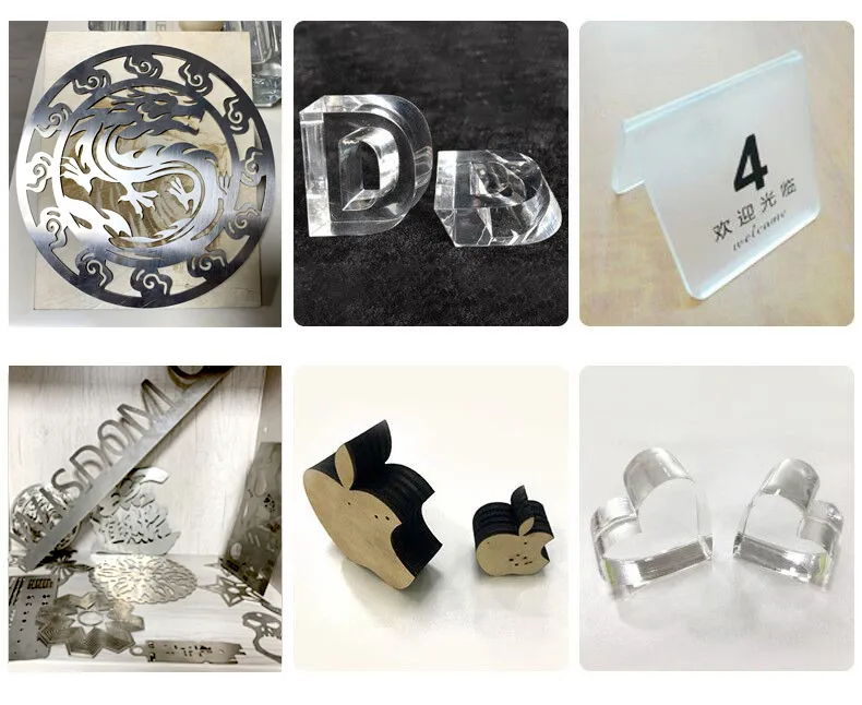 This co2 series machine can cut and engrave acrylic,wood, plywood, mdf, double-layer sheet, cloth, leather, foam,etc non metal materials.At the same time, the machine has added a special system, connected with oxygen-assisted cutting, which can cut thinner stainless steel and carbon steel.The following samples are all produced by our machine.And It is popular in the industries of advertising signs, arts and crafts, architectural models, wine bottle customizing, toys, chothing, shoes, bags, etc.